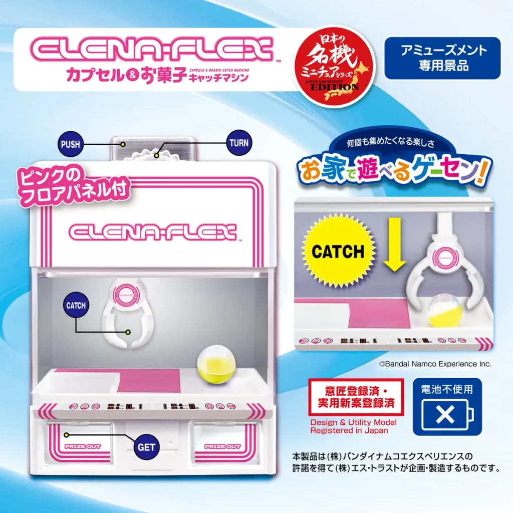 Novelty goods maker S-Trust is transforming another iconic crane game machine into a miniature, playable toy. The latest addition to the company’s “play-at-home arcade” series is Bandai Namco’s Clena Flex machine.